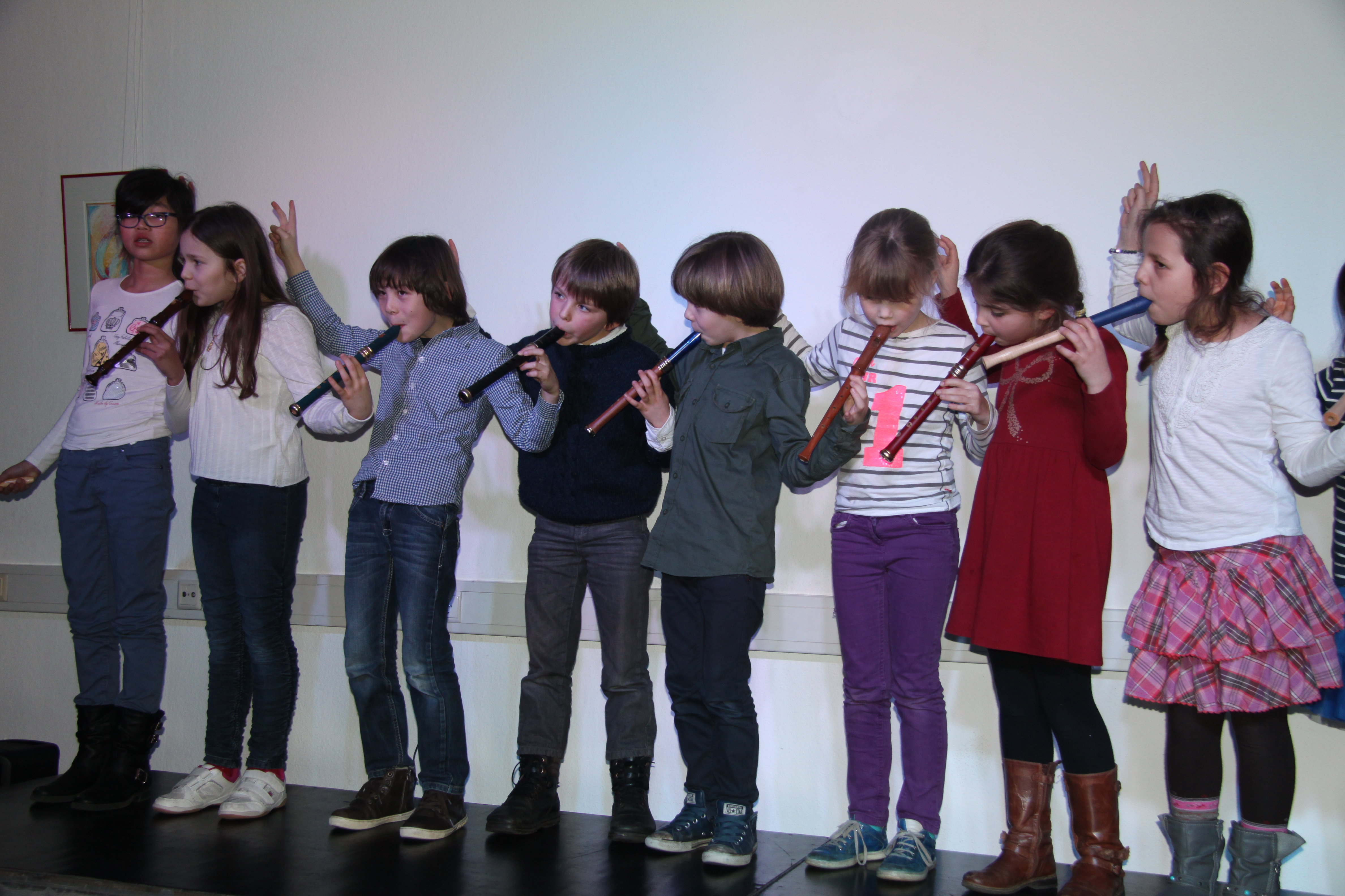 Geschickterweise lief der Zirkusworkshop für Kinder noch und als die „Kleinen“ von 5 bis 10 Jahren dann stolz ihre Vorstellung gaben, war der Theaterraum voll. Den kleinen Künstlern bereitete es sichtlich Spass, mit zwei Blockflöten gleichzeitig oder nahezu akrobatisch auch ganz ohne eigene Hand Blockflöte zu spielen.
