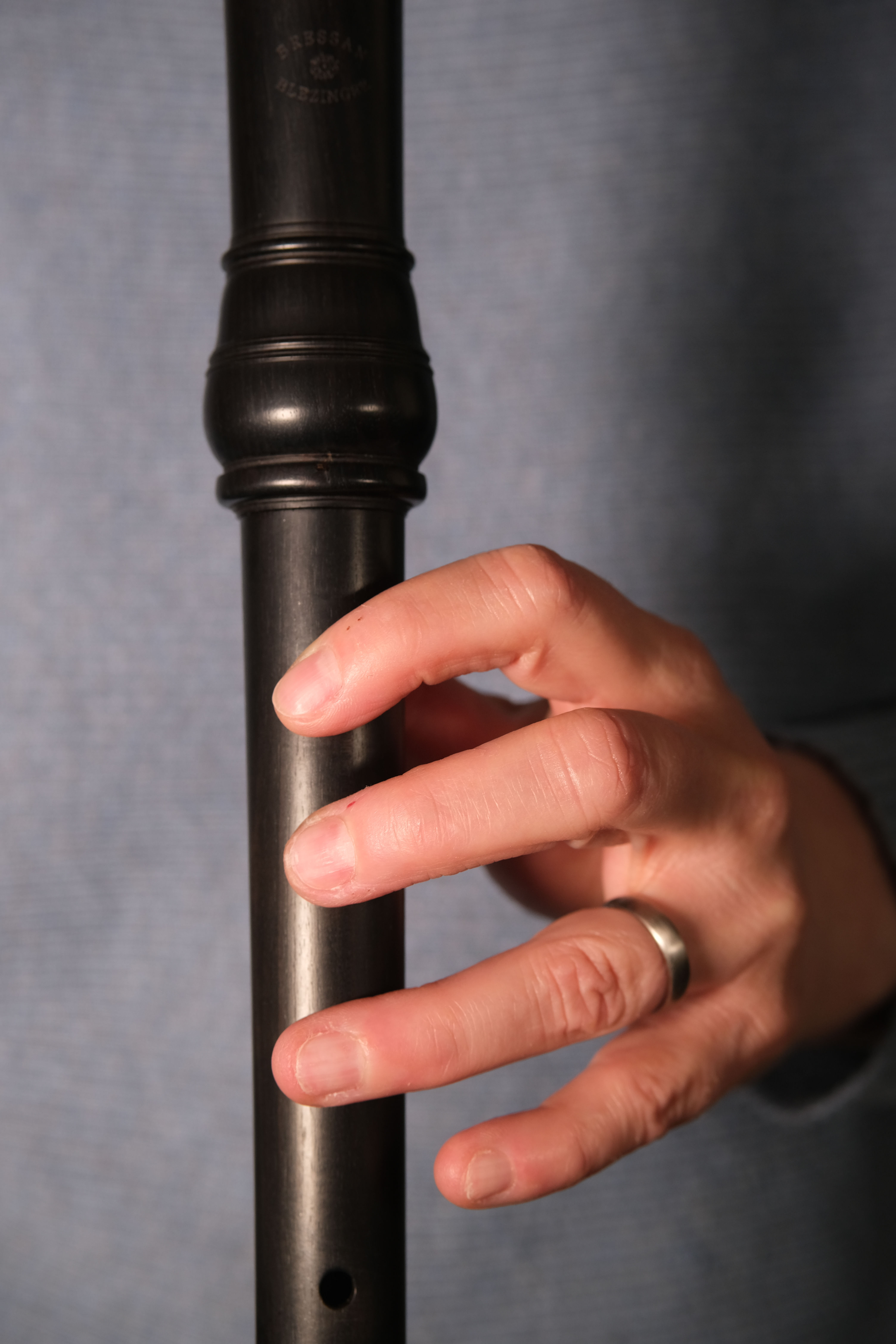 Um Grifflöcher zu schließen, müssen sich die Finger viel mehr spreizen als auf kleineren Instrumenten. Folgende zwei Abbildungen zeigen sehr gut den Vergleich zwischen Handposition der linken Hand auf einer Altblockflöte bzw. einer Bassblockflöte: